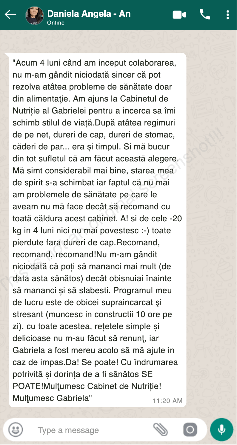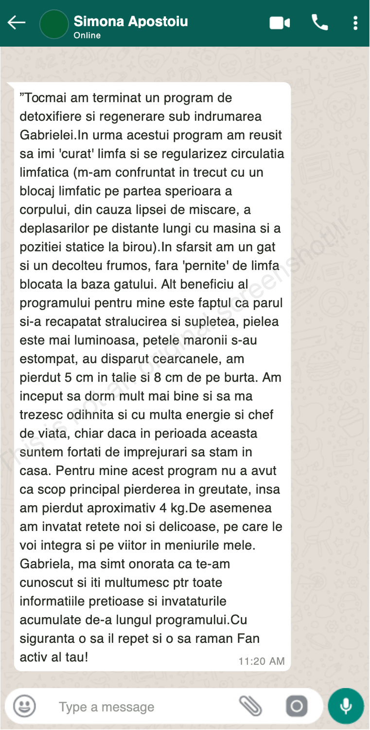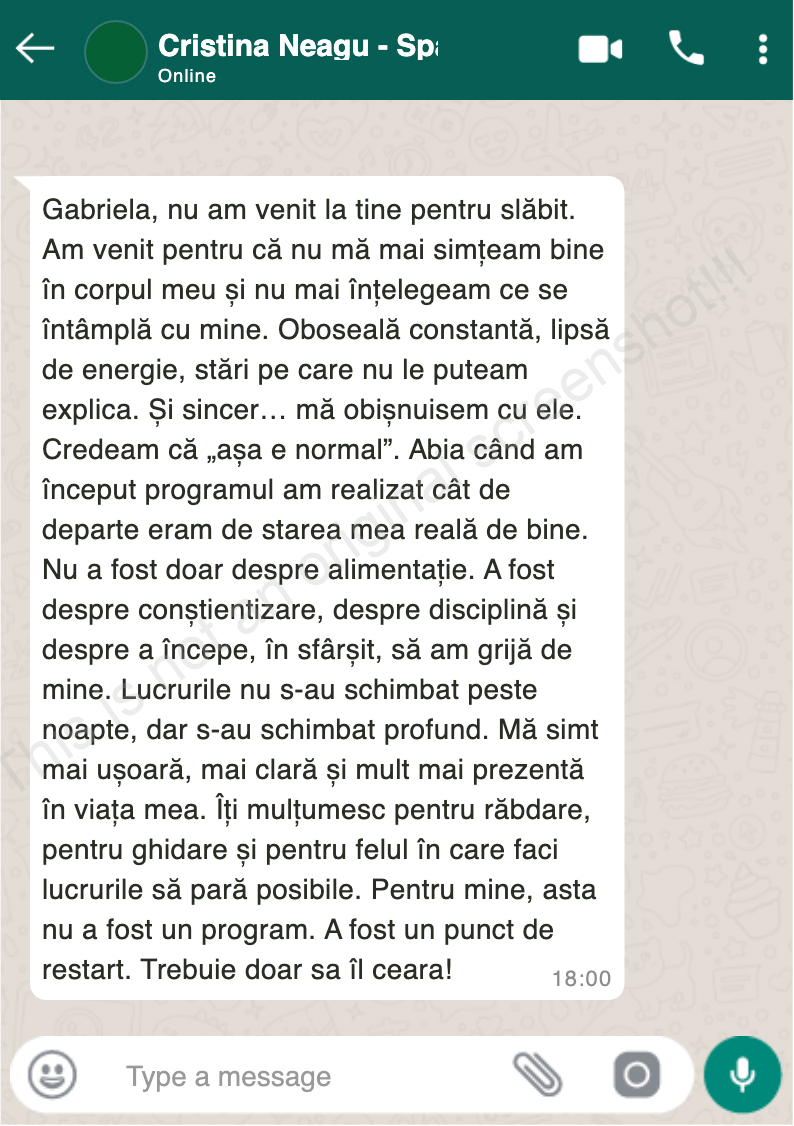 Suport pe tot parcursul programului — nu ești singur/ă în acest proces. Eu personal îți voi ghida procesul. Acces 24/7 pe toate durata programului , pe whatsapp sau telegram.